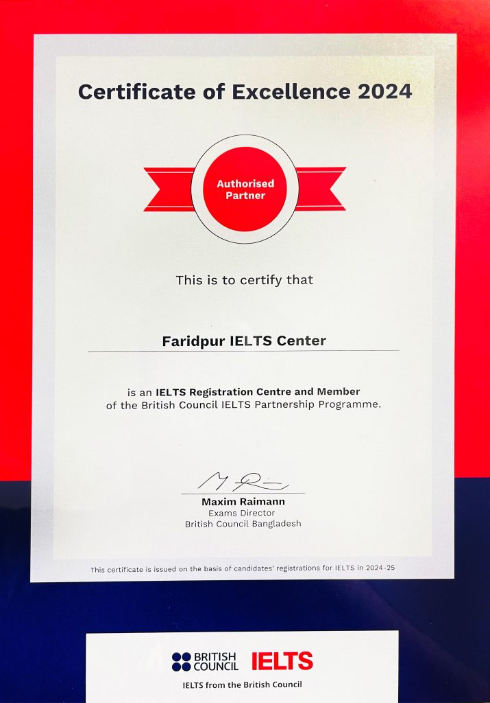 We are thrilled to announce that Faridpur IELTS Center has been awarded the Certificate of Excellence 2024 by the British Council!